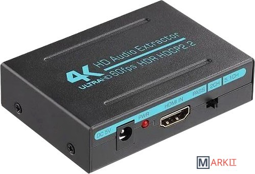 Конвертер звука (HDMI Audio Extractor 4K) позволяет конвертировать аудио сигнал от HDMI в HDMI + SPDIF + RCA (R/L). Устройство позволяет извлекать звуковой сигнал из сигнала HDMI в систему усилителя мощности для получения высококачественных звуковых эффектов, которые трудно достичь в динамиках телевизора или проектора.Модель имеет переключатель между режимами звука Pass/2CH/5.1. С помощью этого HDMI-экстрактора можно подключить любое современное ТВ-оборудование в доме (офисе, магазине или кафе), способное выдавать изображение и звук в стандарте высокой четкости.азрешение HDMI: 1080p/60fps, 4K/30fps, 4K/60fpsПоддержка цветового формата видео: 4K/60fps-YUV444-8bit; 4K/60fps-YUV422-12 bit, 2160p, 10/12 bits. 50/60HzВерсия HDMI 2.0, HDCP 2.2Поддержка AC3, DTS, LPCMHDMI макс. пропускная способность: 600MHzHDMI макс. скорость передачи: 18GbpsПоддерживает частоту дискретизации 192 KHz/24 bitRCA выход (1KHz@0dB): 1V RMSОтношение сигнал/шум (SNR) @0dB(CC1R/ARM):≥90dBЧастотная характеристика: 20 Гц-20 кГцРасстояние между входным кабелем: