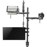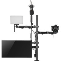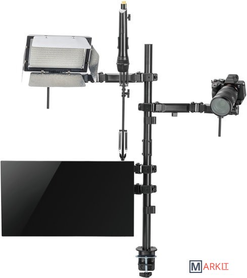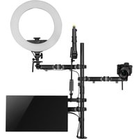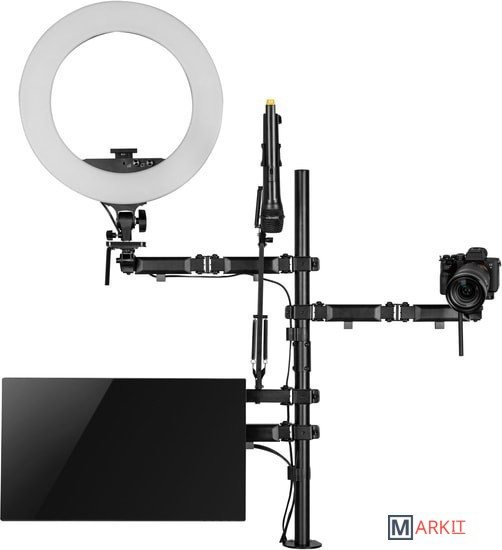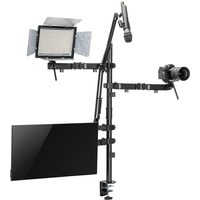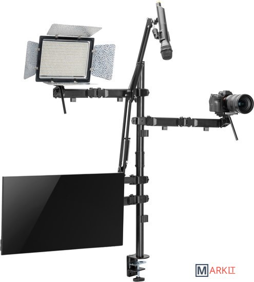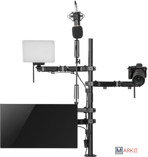 Кронштейн мульти All-In-One с дополнительным креплением для камеры, микрофона и света!Многофункциональное крепление All-In-One из высокопрочной стали надежно закрепит все оборудование и организует комфортное рабочее место.Настольная установка All-In-One состоит из:- 1 держателя для монитора;- 2 держателей для камеры, светового оборудования, смартфона, планшета на выбор;- 1 держателя для микрофона.