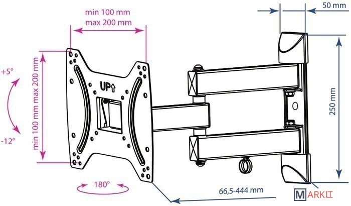 | Угол поворота (без ТВ) | 180 ° |