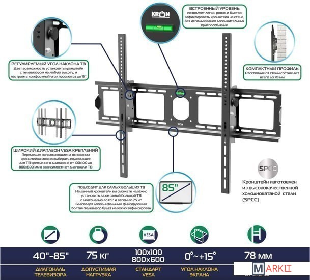 | Совместимая диагональ экрана | 40 — 85 " |