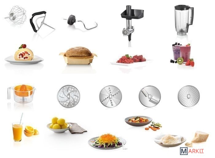 | Функции | мясорубка, блендер, цитрус-пресс, взбивание, смешивание, замешивание дрожжевого теста, терка, шинковка, ломтерезка, драники |