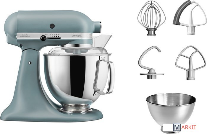 стальная чаша объемом 4,8 л;cтальная чаша объемом 3 л;проволочный венчик;крюк для теста;лопатка для смешивания;лопатка с гибким ребром;защитный обод |