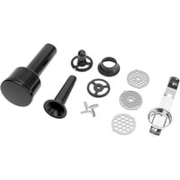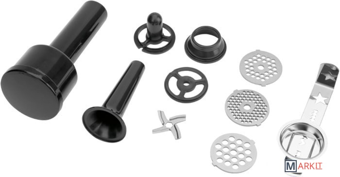 3 диска из нержавеющей стали, нож из нержавеющей стали, насадка для колбас, насадка для печенья (4 формы), насадка для кеббе, металлический лоток |