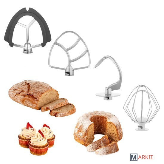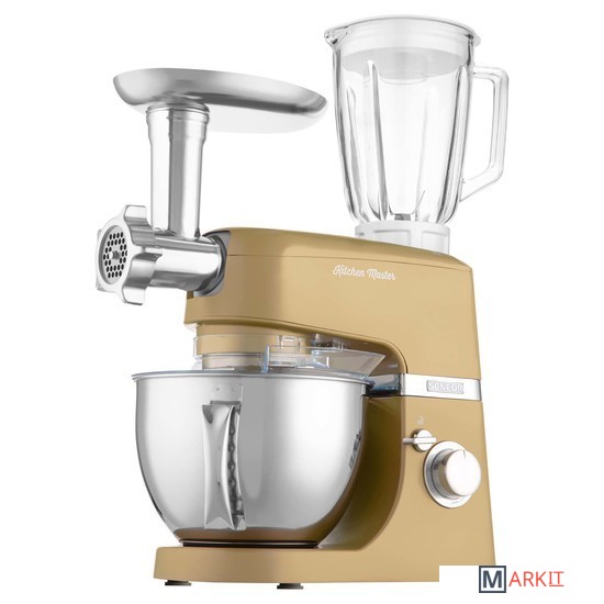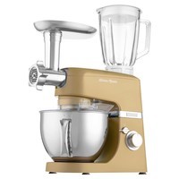 Чаша 4,5лБлендер 1,5лНасадка для смешиванияГибкая насадка для смешиванияНасадка для тестаВенчикМясорубка со сменными дисками для регулировки степени измельчения, насадка для изготовления колбас, насадка для формирования печеньяОвощерезка со сменными терка