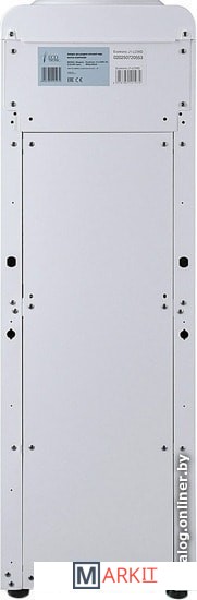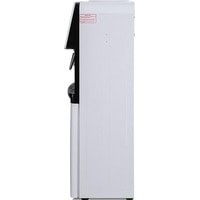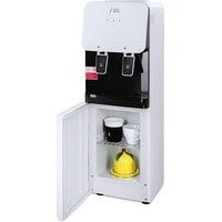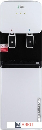 Компактный раздатчик для воды без нагрева и охлаждения. С небольшим шкафчиком в нижней части. Корпус белого цвета с черной вставкой в области кранов подачи воды. Без подключения к сети. Краны «нажим кружкой».
