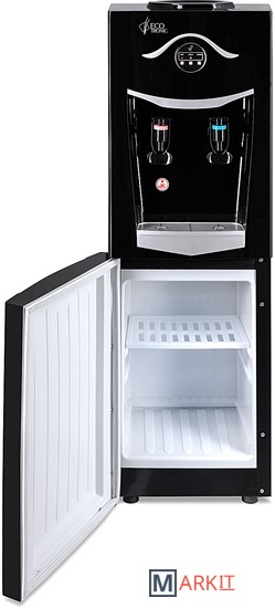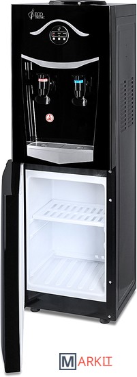 Напольный кулер со шкафчиком. Электронное охлаждение. Корпус черного цвета с серебристой вставкой на лицевой панели. Шкафчик для хранения. Краны нажим «кружкой». Индикация на лицевой панели. Отдельные выключатели на нагрев и охлаждение на задней стенке.