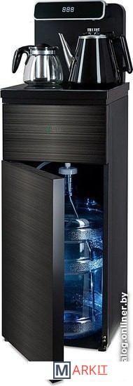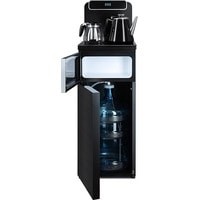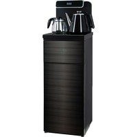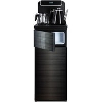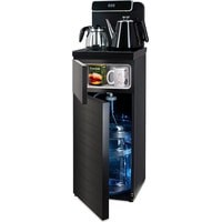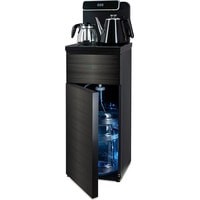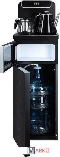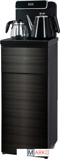 Напольный кулер с чайным столиком. Пульт дистанционного управления. Нижняя загрузка бутыли. Два чайника – для кипячения (изотермический) и заварочный. Без охлаждения, только нагрев. Нагрев воды в чайнике до 100°С. Шкафчик для хранения.Многофункциональный тиабар с пультом дистанционного управления, позволяет управлять аппаратом как на удаленном расстоянии до 7 метров, так и с помощью сенсорной панели управления на русском языке.Функция регулировки температуры воды в чайнике позволяет задавать нужную температуру воды в диапазоне от 40°С до 100°С.Функция регулировки времени подачи воды в чайник – возможность задать время подачи воды в чайник (от 18 до 50 сек).Информационный дисплей в верхней части совмещен с кранами подачи воды. Два чайника, для кипячения и заварочный. Заварочному чайнику можно включить режим постоянного подогрева (~ до 60°С). Чайник кипячения изотермический – меньше греется, лучше сохраняет температуру. Подача воды в него возможна без открытия крышки. Нагрев воды в чайнике включается вручную. Автоотключение нагрева при температуре 100°С.В верхней части корпуса есть шкафчик для хранения продуктов. Корпус черного цвета, передняя панель стеклянная, золотистого цвета. Поверхность чайного столика черная, чайники и кран подачи воды черные с серебристой отделкой.