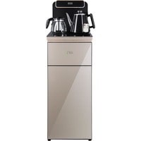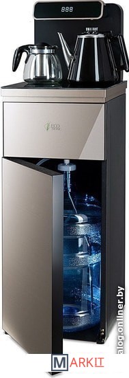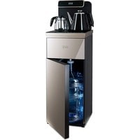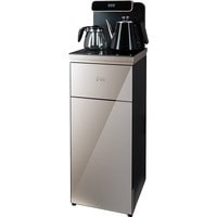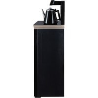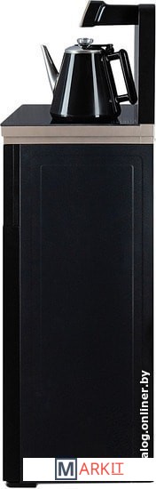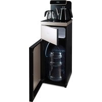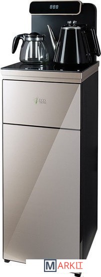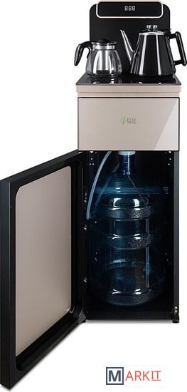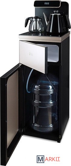 Напольный кулер с чайным столиком. Пульт дистанционного управления. Нижняя загрузка бутыли. Два чайника – для кипячения (изотермический) и заварочный. Без охлаждения, только нагрев. Нагрев воды в чайнике до 100°С. Шкафчик для хранения.Многофункциональный тиабар с пультом дистанционного управления, позволяет управлять аппаратом как на удаленном расстоянии до 7 метров, так и с помощью сенсорной панели управления на русском языке.Функция регулировки температуры воды в чайнике позволяет задавать нужную температуру воды в диапазоне от 40°С до 100°С.Функция регулировки времени подачи воды в чайник – возможность задать время подачи воды в чайник (от 18 до 50 сек).Информационный дисплей в верхней части совмещен с кранами подачи воды. Два чайника, для кипячения и заварочный. Заварочному чайнику можно включить режим постоянного подогрева (~ до 60°С). Чайник кипячения изотермический – меньше греется, лучше сохраняет температуру. Подача воды в него возможна без открытия крышки. Нагрев воды в чайнике включается вручную. Автоотключение нагрева при температуре 100°С.В верхней части корпуса есть шкафчик для хранения продуктов. Корпус черного цвета, передняя панель стеклянная, золотистого цвета. Поверхность чайного столика черная, чайники и кран подачи воды черные с серебристой отделкой.