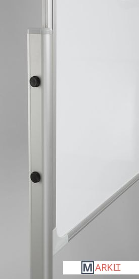 Двусторонний флипчарт с лакированной, магнитной поверхностью для письма сухостираемыми маркерами и крепления информации магнитами. Одна сторона доски со съемной магнитной, металлической прижимной планкой с универсальными пластиковыми держателями для бумажного блока. Устойчивая мобильная подставка на колесиках с механизмом фиксации.
