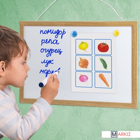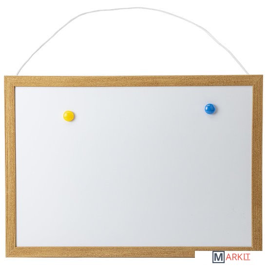 Лаковое покрытие предназначено для письма специальными маркерами для белой доски, а металлическая поверхность позволяет размещать информацию при помощи магнитов. Рама из МДФ придает доске необходимую прочность. Элементы крепления и магниты входят в комплект. Размер — 34,2х48,4 см.