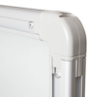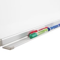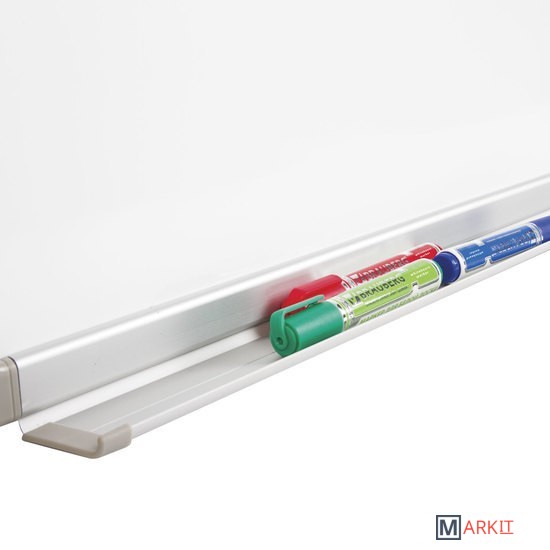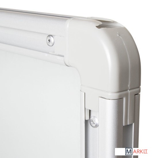 Лаковое покрытие предназначено для письма специальными маркерами для белой доски, а металлическая поверхность позволяет размещать информацию при помощи магнитов. Доска размером 90х180 см имеет укрепленные пластиковые уголки. Профиль придает изделию дополнительную прочность и современный стильный внешний вид. Полочка для аксессуаров и элементы крепления входят в комплект.