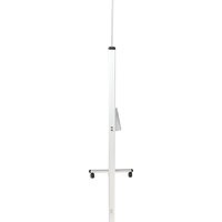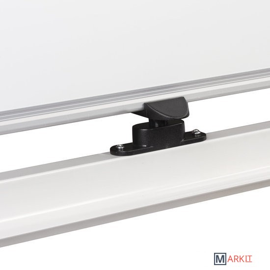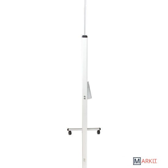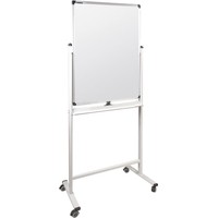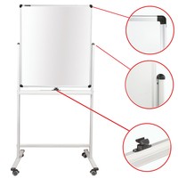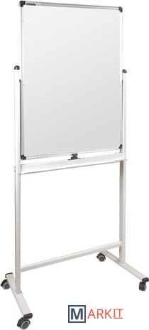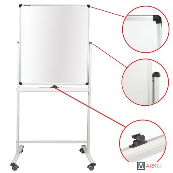 Лаковое покрытие предназначено для письма специальными маркерами для белой доски, а металлическая поверхность позволяет размещать информацию при помощи магнитов. Вращается в горизонтальной плоскости на 360 градусов. Перемещается на колесиках. Алюминиевая рама придает доске необходимую прочность. Элементы крепления входят в комплект. Размер — 90х60 см.