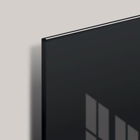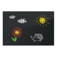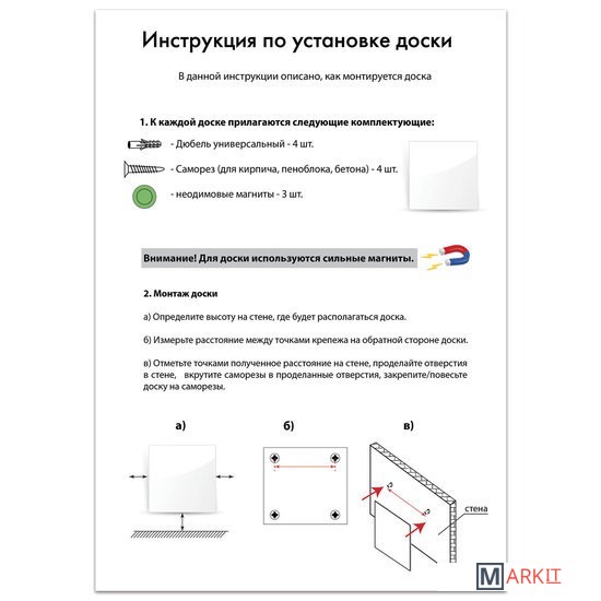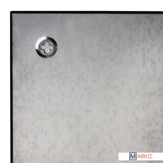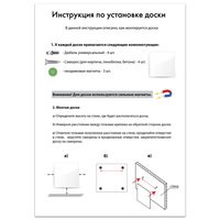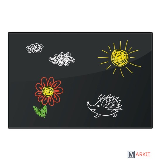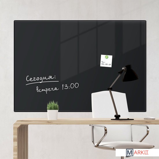 Рабочая поверхность чёрного цвета изготовлена из небьющегося стекла. Размер доски — 60х90 см. Надежно упакована в защитную пленку и красочную подарочную коробку с ручкой. 3 специальных неодимовых магнита и элементы крепления входят в комплект. Скрытый тип крепления с задней стороны поможет вписать доску в любой интерьер.