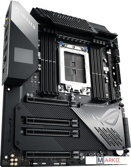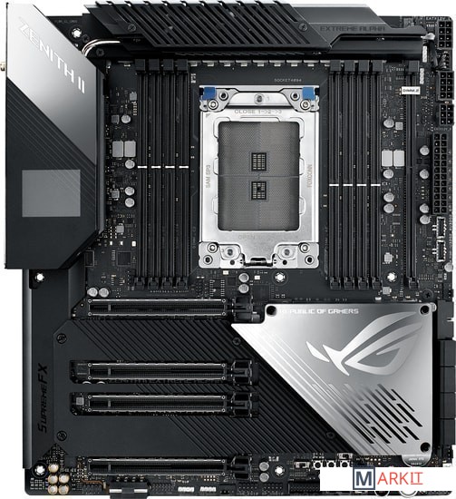 Основным отличием ASUS ROG Zenith II Extreme Alpha стали новые MOSFET. Вместо TDA21472 от Infineon с заявленной нагрузкой 70A в модели не-Alpha, в данной материнской плате установлены TDA21490 на 90A каждый. Поддержка процессоров до 64 ядер.