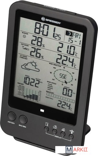 Многофункциональная метеостанция Bresser «5 в 1» – выбор тех, кто хочет следить за всеми изменениями погоды за окном и микроклимата дома. Она проводит измерения внутри и снаружи помещения, показывает текущую информацию, составляет графики изменений за последние сутки и прогноз погоды на ближайшие 12 часов. Вся информация выводится на встроенный экран метеостанции в структурированной и наглядной форме.В верхней половине экрана можно увидеть время, день недели, дату, фазу Луны, а также температуру и влажность в помещении и на улице. Рядом показывается иконка общего уровня комфорта. В нижней половине экрана расположены изображение прогноза погоды, график изменения атмосферного давления, шкала индекса Бофорта, сведения о направлении и скорости ветра, уровень выпавших осадков. Также метеостанция определяет точку росы и тепловой индекс. Под экраном находятся основные кнопки управления. Еще часть кнопок вынесена на заднюю крышку.Метеостанция дополнена беспроводным наружным датчиком, связь с которым прибор может поддерживать на расстоянии до 30 метров. Для питания основного модуля и датчика используются батарейки, т. е. нет необходимости прокладывать по квартире провода. Метеостанцию можно ставить на полку или вешать на стену (крепеж включен в комплектацию).