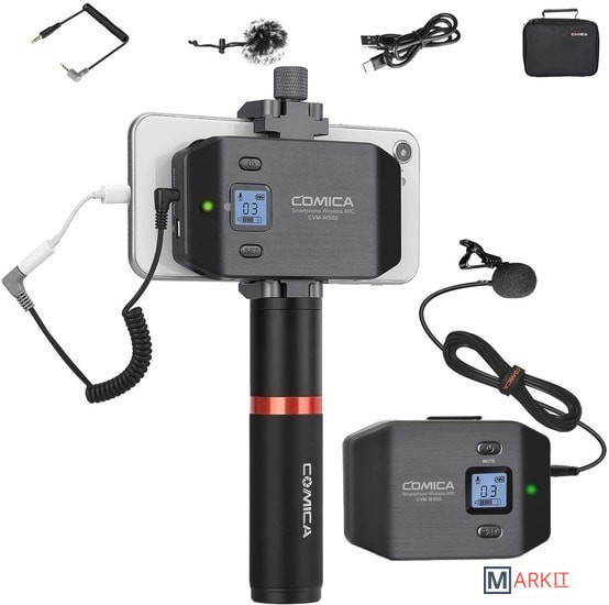 Радиосистема CVM-WS50B с петличным микрофоном идеальна для записи блога или ведения трансляции со смартфона. Также, модель отлично подойдет любителям мобильного кино, поскольку позволяет быстро и качественно записать звук и сэкономить время на сведении.Устройство имеет 6 переключаемых каналов связи, и передаёт сигнал на расстояние до 60 м на открытом пространстве без препятствий. В случае, если во время работы на записи слышны помехи, рекомендуется перевести смартфон в режим "полета".На корпусе трансмиттера и ресивера присутствует ЖК дисплей, показывающий режим работы, номер канала, состояние батареи и уровень сигнала. На ресивере добавлен разъём mini Jack для подключения наушников, что позволяет следить за качеством звука во время съёмки. Зарядить устройство можно при помощи стандартного micro USB.Металлический держатель для смартфона и удобная ручка упрощают работу с записью видео и звука, ведь вы можете снимать установив передатчик в непосредственной близости от мобильного устройства. Это позволяет не путаться в надоедливых проводах и держать всё необходимое в одном месте. К тому же, в затяжном болте держателя предусмотрено крепление 1/4", на него вы можете установить дополнительное оборудование для съёмки.