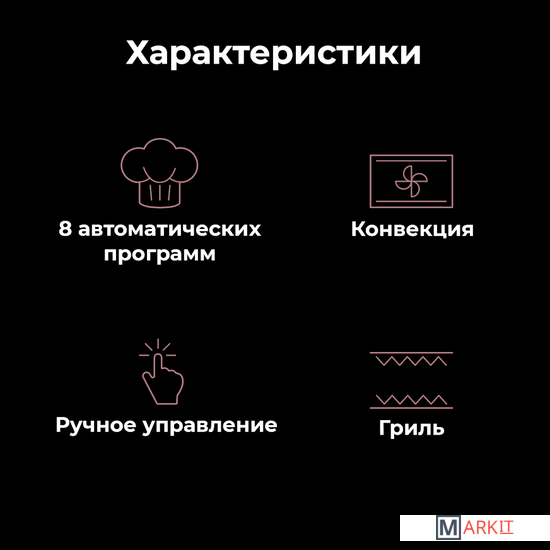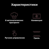 8 автоматических программ приготовления:- хлеб;- пирог;- пицца;- печенье;- стейк;- курица;- расстойка теста;- разморозка.Духовка оснащена верхним и нижним нагревательными элементами с независимым управлением, которые можно дополнительно установить в режим конвекции или гриля для повышения эффективности приготовления.Длина шнура: 0.9 м