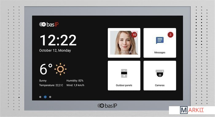 Внутренний 7-дюймовый IP-видеодомофон с IPS-экраном, разрешением 1024x600, возможностью подключения датчиков тревоги, и подключением кнопки звонка. Внутренний видеодомофон работает под управлением операционной системы Android 6.0. Имеет два варианта установки: настенное накладное крепление и крепление врезным монтажом с использованием специального кронштейна.
