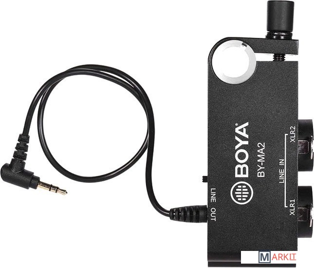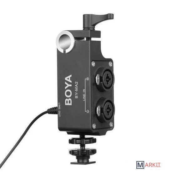 Boya BY-MA2 представляет собой 2-канальный XLR аудио микшер, который предназначен для зеркалок, видеокамеры и других устройств, который имеет 3.5 мм аудио разъём TRS. BY-MA2 имеет 2 аудиовхода XLR, которые позволяют использовать 2 внешних приемника беспроводных микрофонов XLR или микрофоны-дробовики XLR. BY-MA2 может помочь улучшить качество встроенного звука и качество звука на видеокамерах или зеркальных фотокамерах.BOYA BY-MA2 также имеет встроенный комбинированный разъем 6.35 мм, который позволяет подключать инструментальные входы, такие как гитара или другие инструменты с выходным разъемом 6.35 мм. BY-MA2, оснащен стандартной штангой 19 мм, его можно легко прикрепить к любой камере, оснащенной штангой 19 мм.Между тем, в комплект входит адаптер для стержня с болтом на 15 мм, который позволяет ему быть совместимым с любыми клетками со стержнем 15 мм. Внизу он имеет 3 стандартные внутренние резьбы 1/4”-20, которые позволяют этому аудиомикшеру подключаться к любым корпусам камеры (с отверстиями для принадлежностей 1/4) с помощью винта 1/4”-20, или он может располагаться на горячем башмаке цифровых зеркальных фотоаппаратов сразу после правильной установки прилагаемого адаптера для холодного башмака.Основные особенности:- кольцо для крепления 19 мм. (для установки микшера на любой опорной стойке для камеры 19 мм.)- кольцо для крепления 15 мм. (для установки микшера на любой опорной стойке для камеры 15 мм.)- переключатели XLR1/MIX/XLR2- адаптер для крепления холодного башмака- пассивная работа- литое алюминиевое шасси