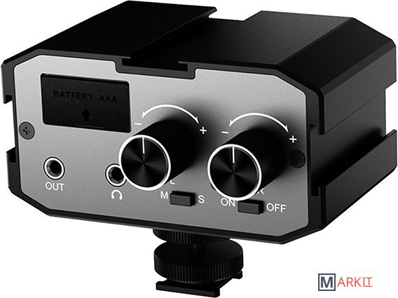 Профессиональный двуканальный микшер поможет вам принимать звуковую дорожку сразу с нескольких источников, при этом качественно обрабатывая их на записи.Портативное устройство имеет три аудиовхода (левый и правый моно и один стерео) благодаря чему, вы можете сэкономить время на сведении звуковых дорожек с нескольких источников. Микшер способен работать с микрофонами как с автономным питанием, так и фантомным.При помощи сразу двух ручек контроля вы можете настроить и усилить аудиосигнал. На задней панели предусмотрен mini Jack выход для наушников, благодаря которому доступна возможность следить за качеством звука прямо во время записи.Целых три крепления на башмак позволяют не только установить микшер в удобном для работы положении, но и добавить на его корпус звукозаписывающие устройства вроде накамерного микрофона или ресивера. Эта особенность избавит вас от лишних проводов и запутанных схем подключения.