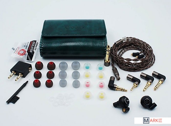 чехол, переходник на 6.3 мм, переходник для самолета (два штекера 3.5 мм), приспособление для регулировки длины кабеля, приспособление(-я) для ухода за наушниками