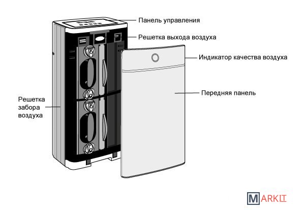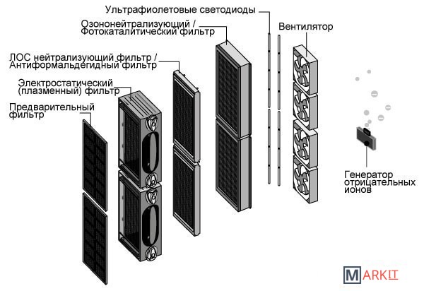 Высокопроизводительный вентилятор постоянного тока.Восемь степеней очистки.Низкое энергопотребление.Ночной режим работы.Автоматический режим.Плазменная (электростатическая) технология очистки воздуха.Фотокаталитическая система очистки воздуха.Стерилизация и антисептическое воздействие ультрафиолета.Фильтры, не требующие замены.Эффективная фильтрация частиц от 0,1 до 0,3 мкм.Эффективное удаление пыли, запахов и табачного дыма.Генерация отрицательных ионов.Встроенный таймер.Датчик очистки фильтров.Цветовой индикатор качества воздуха.Четыре режима настройки производительности.Оперативное удаление вредных газов, таких как ацетон, бензол и т.п.Для удобства перемещения в комплект входят колёсики.
