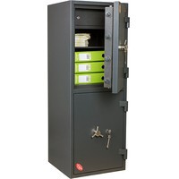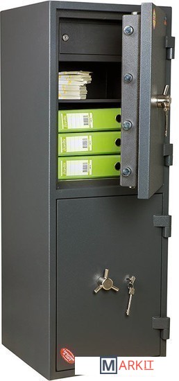 Модель состоит из двух отделений, каждое из которых запирается на замок.Корпус сейфа и дверь заливаются специальным тяжелым бетоном, толщина стенок корпуса составляет 40 мм. На двери сейфа Гранит 120/2 T KL + KL установлен ригельный механизм с 3-х сторонней системой запирания и защита замка и ригелей от высверливания и выбивания, а так-же система блокировки ригельного механизма при выбивании замка.Предусмотрена возможность анкерного крепления к полу. Анкерный болт в комплекте.