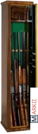 GRIFONE 1503331 — классический оружейный сейф с окраской под дерево. Предназначен для надёжного и комфортного хранения 5 ружей. Сертифицирован на взломостойкость в соответствии с европейским стандартом EN 14450 — класс S1. Корпус и дверь имеют двухслойную стальную конструкцию, изготовлены из стали толщиной 3 мм. Дверь усилена по периметру ребрами жесткости, по всей высоте — противоотрывной шарнир. Трехсторонняя ригельная система запирания — ригели из никелированной стали диаметром 22 мм. Комплектуется сейфовым (класс А, EN1300) ключевым замком, защищенным от высверливания. Ключ нельзя вытащить при незапертом замке, что удобно и безопасно — дверь не останется случайно открытой. Внутри — запираемое патронное отделение и ложементы на пять ружей, выполненные из высокоплотного пеноматериала. Внутренняя отделка — мокет (обивочный бархат). Снаружи сейф оклеен высокоустойчивой к потертостям и царапинам термопленкой, имитирующей дерево (орех, клен). Конструкция предусматривает возможность анкерного крепления сейфа к стене или полу.