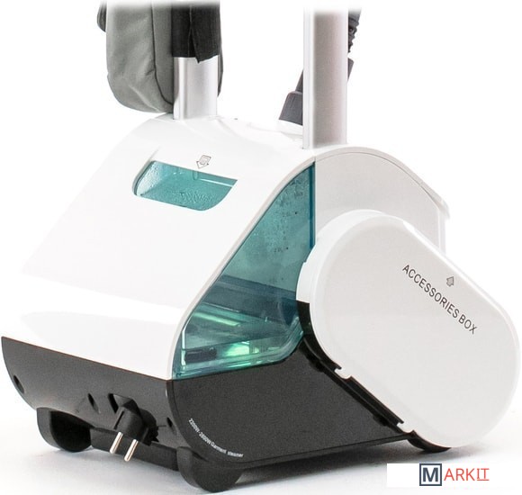 В комплекте приспособление для отпаривания воротника, доска из термостойкого пластика, тефлоновая варежка, зажим для стрелок, вешалка, щетка для бархата, 2 ворсистые щетки, сумка с логотипом.Электронный дисплей и три режима отпаривания. На электронном дисплее отображаются выбранный режим интенсивности отпаривания, суммарное время работы отпаривателя, индикатор готовности пара, индикатор низкого уровня воды, индикатор тревоги, когда вода в баке закончилась.Автоматическая намотка электрошнура. Боковые отсеки для аксессуаров. Футляр для аксессуаров. Электронное управление. Защитное отлючение аппарата.