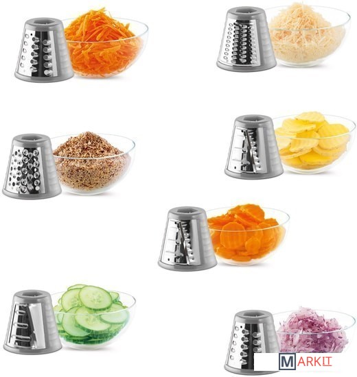 Слайсер может нарезать картофель на тонкие ломтики для жарки, либо фрукты и овощи для украшения блюд и пр.Терка с волнистыми ножами подходит для нарезки фруктов и овощей на оформление различных блюдКрупная терка используется для шинковки овощей на суп, для приготовления картофельных блинов либо овощных и фруктовых салатов и т. д.Мелкая терка подходит для приготовления фруктовых и овощных салатов либо сырных и овощных паст и т. д.Очень мелкая терка предназначена для измельчения / помола кокоса, миндаля, орехов и для приготовления крошек из твердого хлеба и т. д.