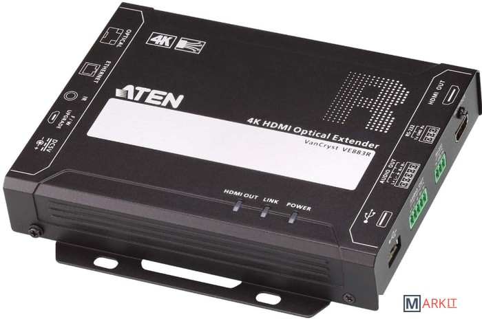 VE883RK2-AT-G – Приемник Оптического Удлинителя ATEN VE883, 4K HDMI Optical Extender (4K@10км (K2, SM)), предназначенный для расширения расстояния передачи несжатого 4K-сигнала до 10 километров.Удлинитель VE883 соответствует спецификациям HDMI, поддерживая функции 3D, Deep Color (до 12 бит) и скорость передачи данных до 10,2 Гбит/с, обеспечивая превосходное качество изображения. Благодаря эксклюзивной технологии FarSmooth компании ATEN удлинитель VE883 предотвращает запаздывание и замирание изображения, выравнивая скорость входящего и исходящего потока. Это гарантирует стабильный, плавный и идентичный с источником видеовывод, что особенно важно при использовании на больших расстояниях, где требуются непрерывность видеопотоков. VE883 оснащен HDMI-входом и выходом, аналоговым аудиовходом и выходом, портом USB2.0, двунаправленным ИК-портом, управляющим портом RS-232, а также портом для подключения Gigabit Ethernet. Для соединения по схеме «точка-точка» (point-to-point) к удлинителю VE883 может быть подключен волоконно-оптический кабель, при установке модулей SFP+ в его оптический порт.Используя дуплексное оптическое волокно совместно с удлинителем VE883, можно получить простое и быстрое решение для оптимальной передачи сигналов Ethernet, ИК, HDMI, RS-232 и USB на расстояние до 10 километров, одновременно избежав нагромождения кабелей. Обеспечивая прозрачную передачу USB-сигналов, удлинитель VE883 является совместимым с широким диапазоном периферийных USB-устройств.При разработке удлинителя VE883 учтены новейшие тенденции в увеличении расстояния и передаче без потерь 4K-сигнала. Поэтому он подходит для применений, где требуется большая дистанция и при этом допускаются небольшие помехи, таких как транспортные станции и современные офисные здания.