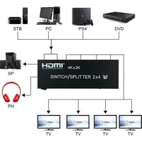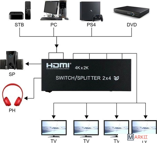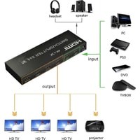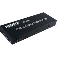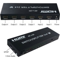 Матричный переключатель HDMI на 2 входа и 4 выхода позволяет одновременно подключать 2 устройства источника сигнала к 4-м дисплеям HDMI: телевизоры, мониторы, проекторы. Работает с помощью дистанционного ИК-пульта. Все дисплеи выводят одинаковое изображение из выбранного источника сигнала. Максимально поддержка разрешение до UltraHD 4K/2K (3840 х 2160), поддержка 3D и цифрового звука.Характеристики:– Аудиоинтерфейс HDMI: jack 3.5mm и оптика SPDIF/TOSLINK поддержка аудиоформатов: DTS-HD/Dolby-trueHD/LPCM7.1/DTS/Dolby-AC3/DSD.– Поддерживает HDR, HDCP2.2, HDMI 1.4b.– Широкая совместимость: матричный коммутатор HDMI может быть совместим с любым устройством HDMI, например, Amazon Fire TV, Apple TV, LE TV, PS 3/4/5 Vedio Games, Macbook, VCD / DVD Plyer, IP TV, STB, Media Box, камера, Xbox360, Xbox one, MIUI Box, Smart Box, Blue-ray Player Chromecast, компьютер, ROKU 4, Wii U, SAT-ресивер, цифровая камера, проектор Tivo, Vizio.– Расстояние между входными кабелями: 8м AWG26 стандартный кабель HDMI. Длина выходного кабеля: 8м AWG26 стандартный кабель HDMI.Комплектация:1 х 4×2 HDMI Switch / Splitter1 x адаптер питания 5V1A1 х пульт дистанционного управления1 х руководство пользователя