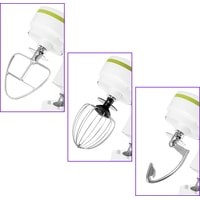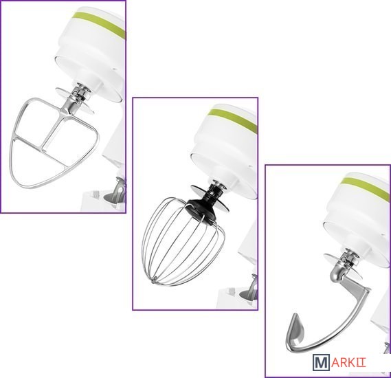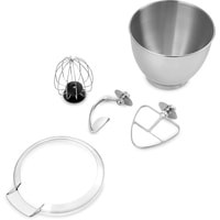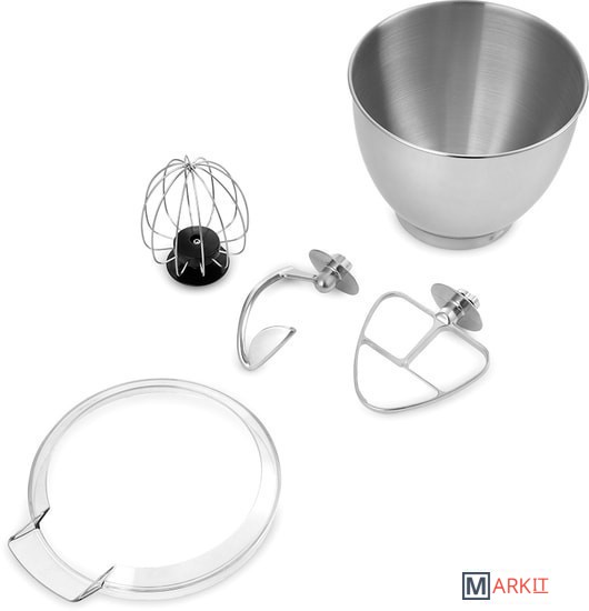 - моторный блок;- чаша миксера;- крышка чаши миксера;- венчик для сбивания;- насадка для смешивания;- крюк;- руководство по эксплуатации. |