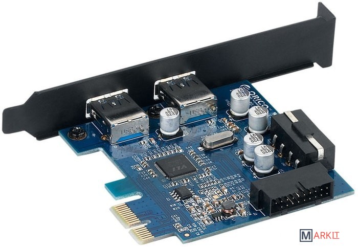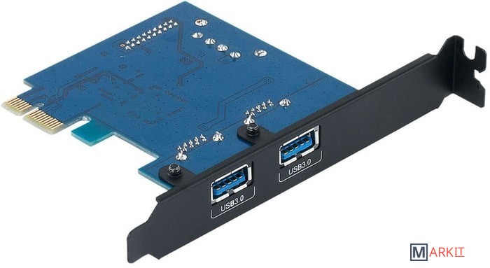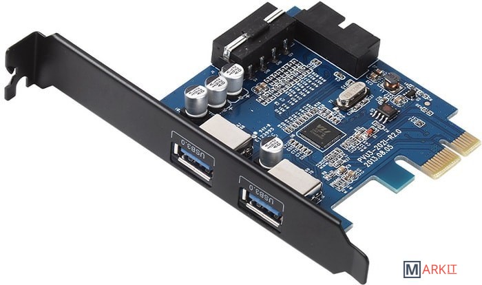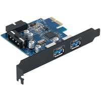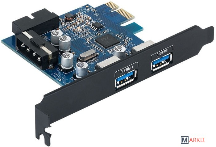 Планка на базе хост-контроллера VIA VL805 содержит два внешних порта USB 3.0 и один внутренний 20-пиновый порт для подключения к USB на передней панели. Подключается к слоту PCI Express, есть разъем для подключения дополнительного питания.В комплект поставки входит кабель питания MOLEX to SATA.