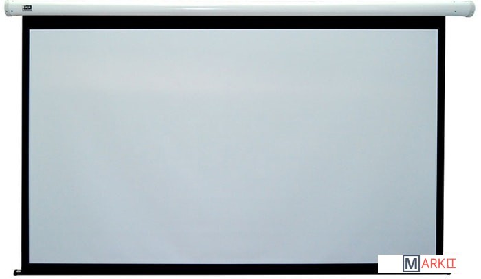 Настенно-потолочный моторизованный проекционный экран в белом корпусе для проектора. Задняя часть полотна окрашена в черный цвет. В комплекте пульт ДУ и 3-хпозиционный настенный переключатель.