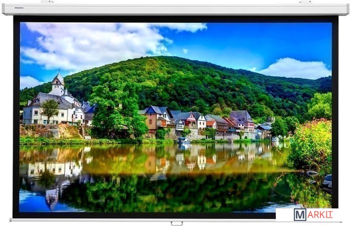 Универсальный настенный экран с ручным управлением. Подпружиненный механизм обеспечивает плавное сворачивание и высокую детализацию изображения.