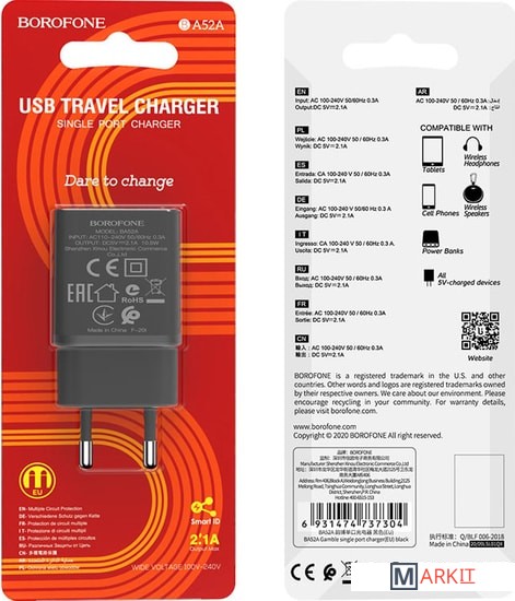 Markit » Зарядные устройства » Сетевое зарядное Borofone BA52A (черный)