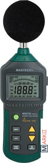 Цифровой шумомер Mastech MS6700 позволяет измерять уровень громкости звука и шумов в большом диапазоне и с высокой точностью. Прибор имеет специальный измерительный микрофон, обладающий очень малой неравномерностью АЧХ и высокой чувствительностью, усилитель, корректирующий фильтр и большой ЖК-дисплей для отображения полученных результатов измерения. Помимо цифровой индикации результатов измерения в шумомере Mastech MS6700 предусмотрена графическая шкала для мнемонического отображения величин.Прибор можно подключать к персональному компьютеру с помощью последовательного порта RS-232 для последующей обработки полученных данных. В условиях недостаточной видимости подсветка дисплея поможет прочитать полученные данные. Питание прибора осуществляется с помощью батареи питания 9В типа "Крона" или внешнего адаптера питания 9В. Цифровой измеритель уровня громкости Mastech MS6700 имеет сертификат РосТеста.