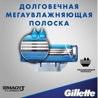Сменные кассеты к мужским бритвам Gillette MACH3 Turbo оснащены 3 лезвиями прочнее стали, которые дольше сохраняют остроту.Сменные кассеты Gillette MACH3 Turbo с более острыми, быстро режущими лезвиями Turbo (первые 2 лезвия по сравнению с MACH3) рассчитаны на 15 процедур комфортного бритья.Эти бритвы Gillette оснащены долговечной гелевой полоской, которая обеспечивает превосходное скольжение бритвы.Защитный микрогребень Skin Guard бритвы MACH3 Turbo растягивает кожу и подготавливает волоски к срезанию.