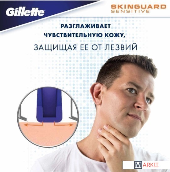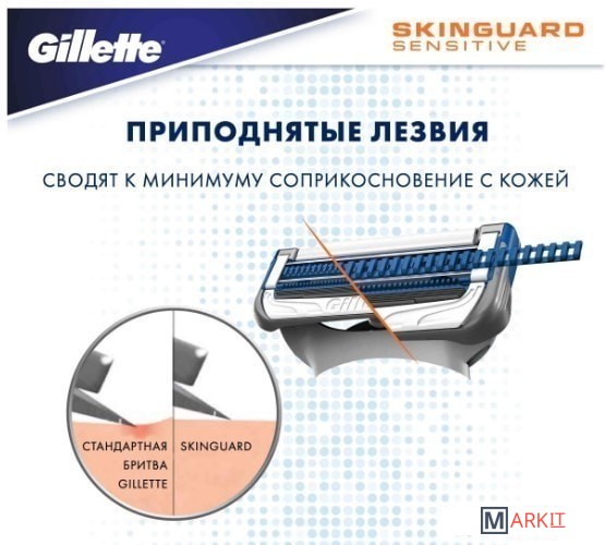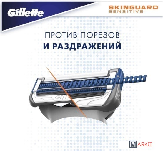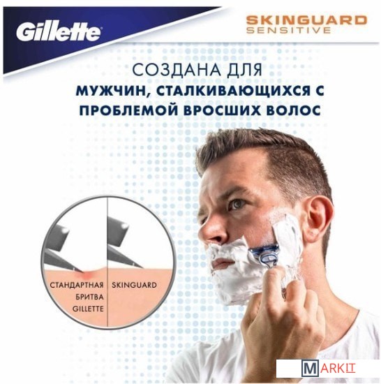 Лезвия Gillette SkinGuard — это революционный продукт Gillette. Кожа каждого мужчины уникальна. Если у вас акне или чувствительная кожа или же вы боитесь воздействия бритвы с несколькими лезвиями, бритва Gillette SkinGuard создана для вас. Уникальная полоска SkinGuard между лезвиями сбривает волосы, не повреждая кожу. Полоска SkinGuard между лезвиями сокращает трение и позволяет срезать волосы на уровне кожи, уменьшая контакт между кожей и лезвиями. Новая бритва Gillette SkinGuard — это также первая бритва Gillette в России с двойными увлажняющими полосками, которые увлажняют кожу и обеспечивают гладкое бритье.Эта бритва с двумя лезвиями также включает точный триммер. Точный триммер с обратной стороны прекрасно подходит для бритья труднодоступных зон на лице. С его помощью можно ухаживать за бородой и усами. Что бы вы ни предпочитали — чистое бритье, усы или бородку — лезвия SkinGuard помогут вам создать желаемый образ.