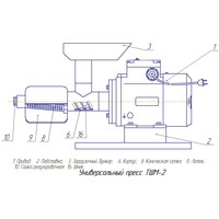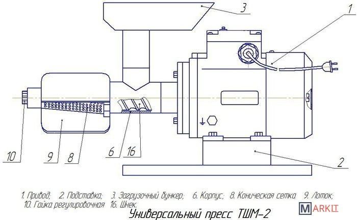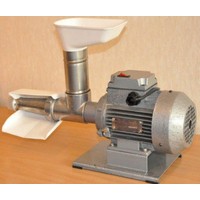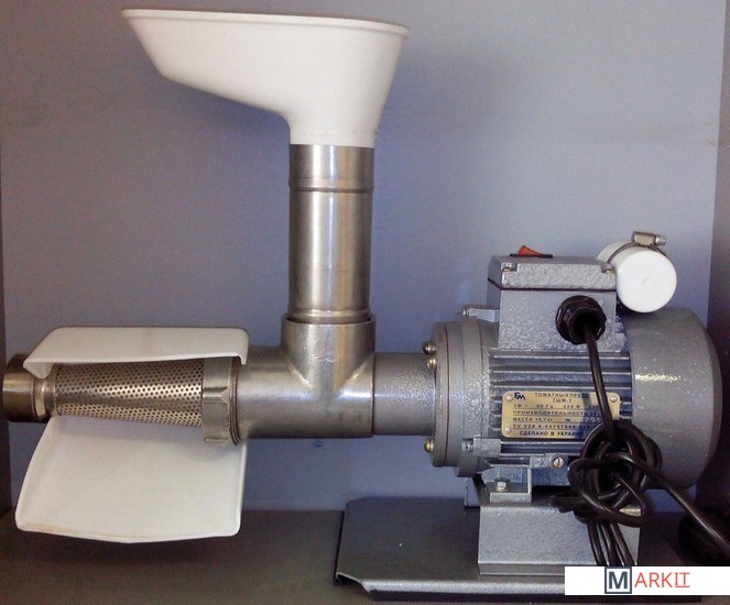Томатный пресс ТШМ-2 предназначен для получения сока с мякотью из помидоров и ягод (вишня, абрикос, клубника,малина, слива, виноград т.п.) способом прессования. Жмых после первого отжима можно пропускать через пресс повторно для более полного отжима.Пресс состоит из электропривода 1, корпуса 6, конической сетки 8, шнека 16, загрузочного бункера 3. Виноград засыпается в загрузочный бункер 3, и с помощью толкателя (придается в комплекте) досылается к шнеку 16. Шнеком транспортируется в корпус 6 и затем к конической сетке 8, где и происходит отжим сока. Жмых отделяется с помощью конуса, который регулируется гайкой 10. Отжатый жмых выходит через зазор между конической сеткой 8 и регулировочным конусом. Для удобства сбора сока имеется лоток 9, который одевается на сетку 8. Производительность при отжиме винограда: 60 кг/час. Производительность при отжиме томатов: 120 кг/час.