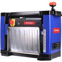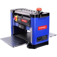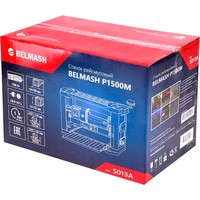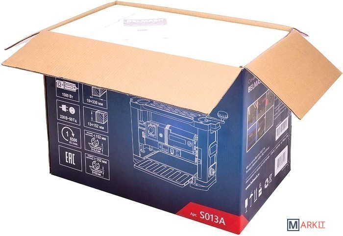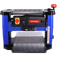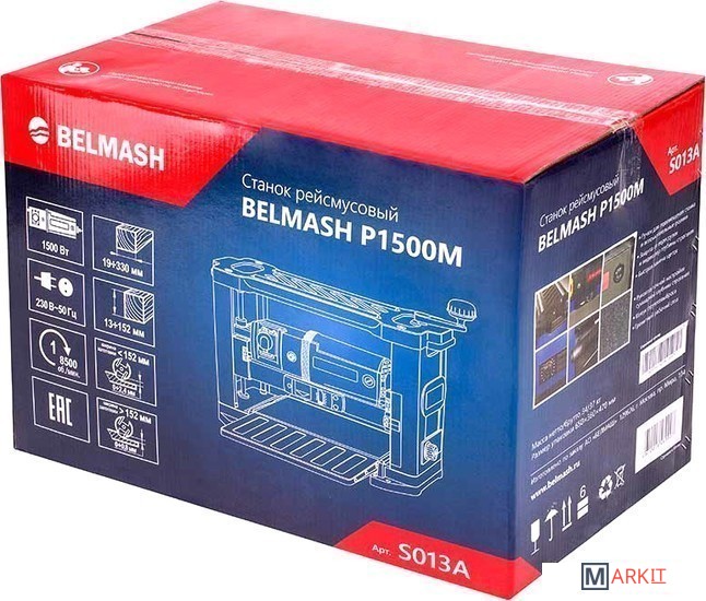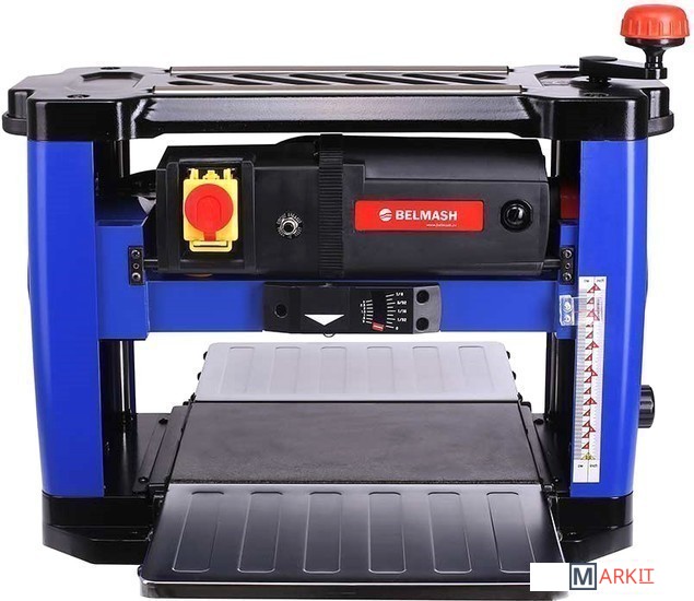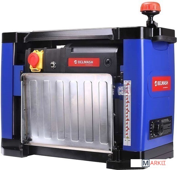 Рейсмусовый станок BELMASH P1500M предназначен для предварительного и чистового строгания (рейсмусования) древесины. Изделие оснащено литым основанием с отверстиями для крепления к верстаку, несущими стойками, гранитным рабочим столом и откидывающимися удлинителями с ребрами жесткости. Стальной вал с двумя ножами двусторонней заточки, приводится во вращение коллекторным двигателем через ременную передачу. Крышка-фиксатор на сетевом выключателе, предотвращает несанкционированное включение. При возникновении перегрузки срабатывает защита. Модель оборудована индикатором строгания, отображающим высоту снятия за один проход, и рукояткой регулировки, перемещающей рабочую платформу. Установка конечной толщины обработки производится рукояткой точной настройки суммарной глубины строгания, расположенной на правом торце корпуса. Подача заготовки происходит автоматически. Обрезиненные ручки расположены по бокам верхнего ограждения корпуса. Для возврата предварительно обработанного материала и повторного прогона, в верхней части станка предусмотрены протяжные ролики. Наличие кожуха (крепится двумя винтами-барашками) и универсального адаптера (Ø53/100 мм) позволяет подключать устройство пылеудаления. Патрубок отвода отходов резания направляется как в правую, так и в левую сторону.
