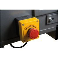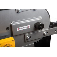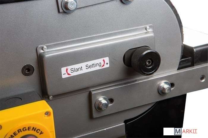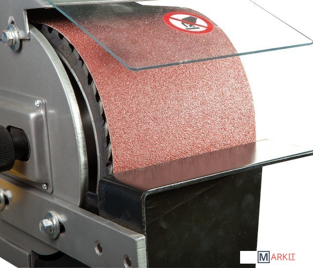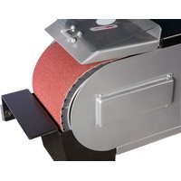 JBSM-150 - универсальный ленточный шлифовальный станок. Он предназначен для окончательной шлифовки готовых деталей или заготовок, обработки сварных швов, снятия ржавчины и заусенцев. Это старшая модель в линейке, ширина шлифования (как и ширина абразивной ленты) - 150 мм. Максимальная длина шлифования у этого станка - 500 мм, длина ленты 200 мм. Чтобы устранить ее проскальзывание, ведущий и ведомый ролики имеют обрезиненную поверхность. Несмотря на то, что станок оснащен мощным электродвигателем на 4 кВт, подключить его можно к стандартной бытовой электросети напряжением 230 В. Привод обеспечивает постоянное движение ленты со скоростью 29 м/сек. Для удобства работы рама станка имеет приспособление для ее подъема до +30° и опускания до -15°. Чтобы обезопасить оператора, у JBSM-150 имеется защитный экран наиболее вероятной травматической зоны над ведомым роликом. Если не требуется шлифовать крупные заготовки по длине ленты, ее можно закрыть защитной крышкой. рядом с рабочей зоной предусмотрена кнопка аварийного отключения питания. Чтобы эффективно отводить пыль и стружку, неизбежно образующихся при шлифовке, станок оборудован устройством пылеотсоса с диаметром патрубка 97 мм. Также к JBSM-150 можно подключить внешний пылеотсос с диаметром парубка 100 мм. Станина у данной модели имеет повышению прочность и жесткость. Ее широкое основание обеспечивает устойчивость и снижает вибрации при работе. Как и все оборудование JET данного класса, станок полностью готов к работе, необходимо лишь установить его и закрепить на полу при помощи болтов. JBSM-150 комплектуется всем необходимым, в том числе и шлифовальной лентой (класс зернистости - 60).