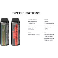 | Комплектация | - кабель для зарядки (USB Type-C)- картридж 2 мл- испаритель 0.6 Ом- испаритель 0.8 Ом- документация |