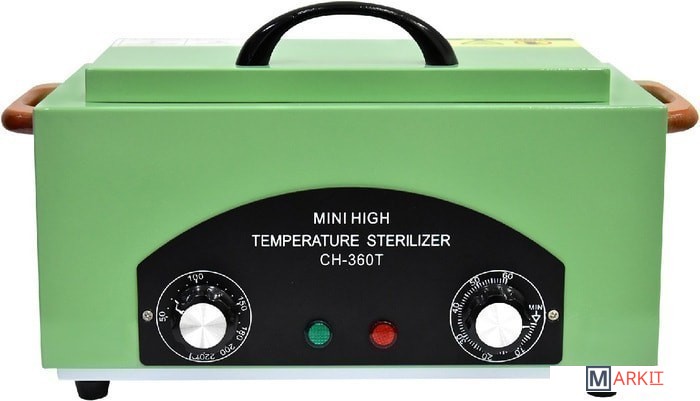 Внутренний блок термического стерилизатора изготовлен из нержавеющей стали. Внутри прибора есть специальный съемный контейнер для хранения и стерилизации инструментария.Объем камеры: 1.8 л.Размер камеры (мм): 250 x 120 x 60.Размер стерилизатора (мм): 310 x 140 x 180.Таймер: от 0 до 60 минут.Терморегулятор: от 0 до 220 °C.