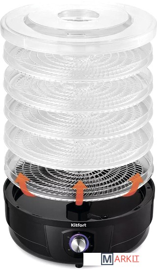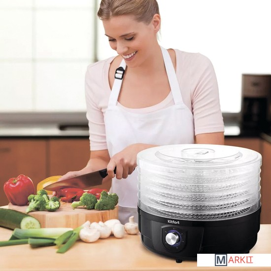 Полезные лакомства круглый год!Электрическая сушилка КТ-1928 предназначена для сушки овощей, фруктов, ягод, грибов, корнеплодов, трав и зелени, а также хлеба. С электросушилкой Kitfort KT-1928 у вас всегда под рукой будет полезная и вкусная еда.Вращающиеся поддоныВ сушилке установлен вал, благодаря которому поддоны вращаются вокруг своей оси, что обеспечивает идеальную сушку продуктов!Управляйте процессом сушки!На передней панели устройства есть регулятор, с помощью которого вы можете включить и выключить устройство, установить температуру в диапазоне от 40 до 70°C. Регулятор имеет плавное переключение температур.Наблюдайте за сушкой!Сушилка имеет в комплекте 5 поддонов из прозрачного пластика, поэтому вы легко можете наблюдать за процессом сушки любимых продуктов. Устанавливайте от 1 до 5 поддонов друг на друга в зависимости от количества продуктов.Равномерная сушкаСушилка оборудована мощным нагревательным элементом и вентилятором, благодаря которым нагретый воздух равномерно распределяется по всему объёму камеры. Прибор КТ-1928 создаёт идеальные условия для качественной сушки продуктов.Легко разобрать и очистить!Все поддоны легко снимаются и моются после сушки. Если на поддоны налипли продукты, замочите их на некоторое время в тёплой воде. После мойки протрите поддоны полотенцем и просушите их.Быстро и вкусно!Для более быстрой сушки порежьте продукты на кусочки. Чем мельче кусочки, тем быстрее они высохнут. При сушке ягод и прочих мелких продуктов положите на поддоны марлю, чтобы ягоды не проваливались сквозь ячейки.Длина шнура: 1 м.Диаметр поддонов: 310 мм.Уровень шума: 40 дБ.