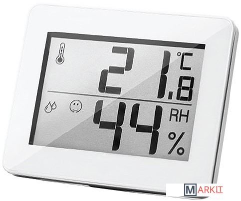 Современный комнатный термогигрометр HALSA предназначен для определения температуры и влажности воздуха в комнатных условиях.На компактном монохромном LED дисплее под любым углом видны крупные цифры и символы температуры и влажности.Усовершенствованный высокочувствительный встроенный датчик с точностью измерения температуры до 1 °C и влажности до 1 % быстро и качественно определяет климат в помещении. Удобное переключение выбора единиц измерения температуры (°С/°F).Термогигрометр оснащен режимом запоминания максимальных и минимальных значений температуры/влажности на 24 часа.Устройство удобно не только крепить на стену, но и устанавливать на любую горизонтальную поверхность благодаря встроенной складной подставке.В качестве питания используется батарейка-таблетка CR2025 (входит в комплект).Диапазон измерения температуры: 0…+50 °С (+32…+122 F°)Точность измерения: +/-1 °С при температуре 0…+40 °С, в других диапазонах +-2 °С