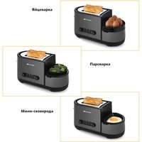 "3 в 1": тостер, съёмная сковорода с антипригарным покрытием, пароварка и яйцеварка.Тостер - 1 штДержатель для яиц - 1 штСтимер - 1 штПоддон для готовки на пару - 1 штКрышка - 1 штМерный стакан - 1 штЛопатка - 1 штРуководство по эксплуатации - 1 шт
