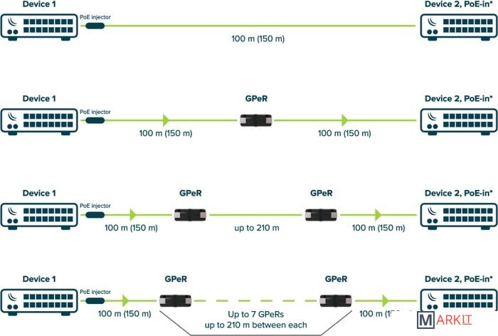MikroTik GPeR - повторитель для гигабитной пассивной сети Ethernet – лучший способ расширить вашу сеть Ethernet в самых сложных местах. Максимальная длина кабеля Ethernet CAT6 между GPeR и источником питания/маршрутизатором составляет до 100 м. Максимальная длина кабеля Ethernet CAT6 между двумя устройствами GPeR составляет до 210 м.Данный повторитель особенно удобен для высотных офисных зданий, жилых домов и помещений дляковоркинга, для которых характерно большое количество этажей и секций, в случае чего очень длинныекабели Ethernet или оптоволоконные кабели могут стать проблемой. Модуль GPeR прост, функционален ине имеет ничего лишнего.