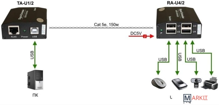 Комплект TA-U1/2+RA-U4/2 предназначен для удлинения интерфейса USB 2.0 по кабелю витой пары на расстояние до 150м. К приемнику RA-U4/2 можно подключить до 4х устройств, таких какпринтеры, WEB камеры, flash накопители и др.Скорость передачи до 200 Мбит/c.Передатчик TA-U1/2 не требует дополнительного питания (питание от USB). Приемник питается от блока питания DC 5V из комплекта поставки.Размеры передатчика и приемника (ШxВxГ): 63x25x78мм. Рабочая температура: 0..+55°С.